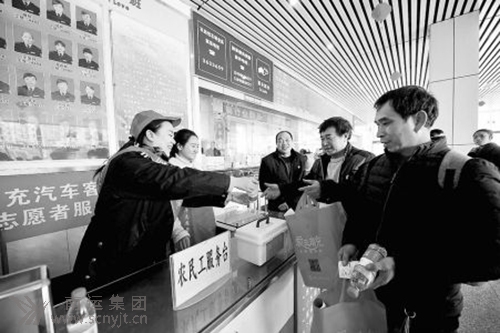 1月21日上午,家住宜賓高縣的李世強(qiáng)和幾名老鄉(xiāng)來到南充汽車客運(yùn)站,準(zhǔn)備乘車回家。在站前廣場上,他們收到了福袋禮包,在站內(nèi)收到了工作人員送上的礦泉水。隨著春運(yùn)大幕開啟,記者在南充各大汽車客運(yùn)站看到,車站紛紛提供溫馨服務(wù),讓農(nóng)民工順暢返家。 李世強(qiáng)和老鄉(xiāng)一直在營山縣一家工地務(wù)工,隨著春節(jié)臨近,為了避開春運(yùn)高峰,他們決定提前返家。21日上午,他們扛著大包小包來到南充汽車客運(yùn)站站前廣場。在嘉陵區(qū)總工會(huì)、人社局、團(tuán)區(qū)委組織的農(nóng)民工服務(wù)點(diǎn),他們不僅收到了工作人員遞上的裝有“!弊值母4、對聯(lián)、紅包等禮品,還收到了工作人員送上的《安全生產(chǎn)與職業(yè)健康知識讀本》《勞動(dòng)者求職須知》《勞動(dòng)者維權(quán)須知》等宣傳資料。站內(nèi)設(shè)有農(nóng)民工服務(wù)臺,車站工作人員還為他們送上礦泉水!吧鐣(huì)如此關(guān)愛農(nóng)民工,讓我們感到很溫暖!崩钍缽(qiáng)說。 為了方便農(nóng)民工返家,南充汽車客運(yùn)站專門設(shè)置了農(nóng)民工售票窗口、檢票通道,還設(shè)置了“農(nóng)民工報(bào)平安”免費(fèi)親情電話。記者在市內(nèi)其他汽車客運(yùn)站也看到,車站均推出了相應(yīng)的溫馨服務(wù)措施,讓農(nóng)民工高高興興地返家。 (李奎 林欣 陳村銘) ——摘自《南充日報(bào)》