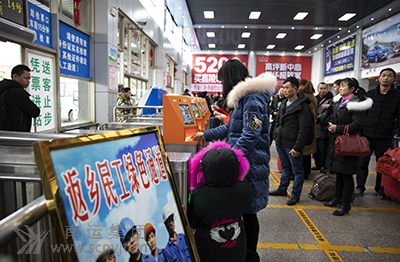 售票大廳里旅客購票秩序井然。7個售票窗口排著購票的旅客隊伍。車站網(wǎng)上購票的旅客已增加到約占一半。在四川汽車票務網(wǎng)兩名工作人員和1名“小紅帽”站務人員的引導下,絡繹不絕的旅客在10臺自助(售)取票機前便捷的取(購)票。為了方便農民工回家返崗,車站專門設置了農民工服務臺,農民工優(yōu)先售票窗口,農民工檢票進站綠色通道,車站工作人員熱情為農民工提供指路、購票、咨詢、搬運行李、維護秩序等服務,深受農民工歡迎。