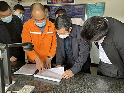 省交通運(yùn)輸廳航務(wù)海事中心安全總監(jiān)羅奎盛(右二)查閱例檢記錄。