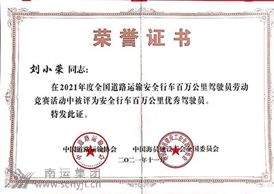 南運(yùn)集團(tuán)3名駕駛員榮獲“2021年度全國(guó)道路運(yùn)輸安全行車 百萬(wàn)公里勞動(dòng)競(jìng)賽優(yōu)秀駕駛員”稱號(hào)