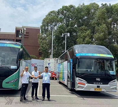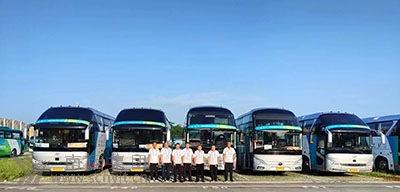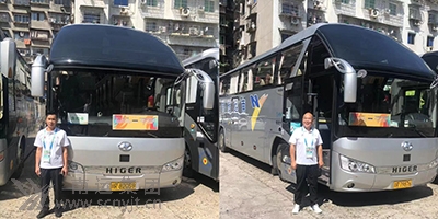 順慶分公司川R82059譚德平(左)和川R79876周永政(右)兩名駕駛員開行“大運(yùn)村——東安湖體育公園主體育場(chǎng)”豪華大巴留影。