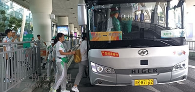 大學(xué)生運(yùn)動(dòng)員正在登上南運(yùn)集團(tuán)川R87162號(hào)黨員先鋒號(hào)駕駛員楊柳的“大運(yùn)村----成都雙流國(guó)際機(jī)場(chǎng)”的豪華大巴。