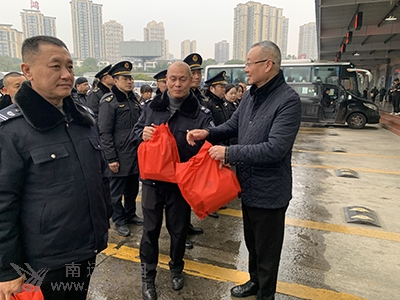南充市交通運(yùn)輸局一級(jí)調(diào)研員張世民向駕駛員贈(zèng)送春運(yùn)禮包