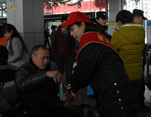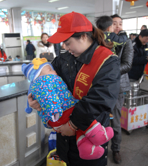 頭戴“小紅帽”的“匡紅艷愛(ài)心班”的站務(wù)人員,身佩大紅授帶,不斷地穿行在售票廳、候車(chē)廳。有為購(gòu)票旅客解答疑難的導(dǎo)乘人員,有在咨詢(xún)處為旅客不厭其煩耐心解答的咨詢(xún)?nèi)藛T,有在車(chē)站候車(chē)廳為旅客送鮮開(kāi)水的服務(wù)人員,還有嘉陵區(qū)團(tuán)委安排的4名青年志愿者,他們滿(mǎn)腔熱情地扶老攜幼,在行包安檢后幫提行李,讓旅客順利的登上返程班車(chē)。一位獨(dú)自一人去墊江的女乘客放心的將自己不到一歲的小寶寶遞交給“小紅帽”站務(wù)人員抱著,以便自己入廁,當(dāng)又抱回自己的小寶寶后,非常感謝“小紅帽”的幫助。