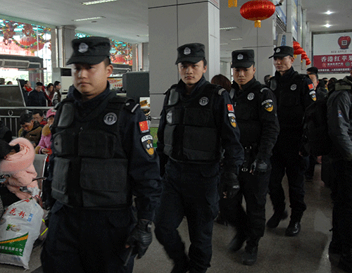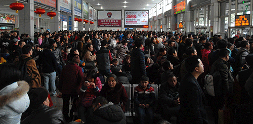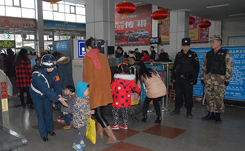 中午1點(diǎn)多鐘,由于成南高速公路私家小車(chē)流量增大,嚴(yán)重堵車(chē),造成加班車(chē)輛不能及時(shí)返回車(chē)站,致使到成都的旅客排著兩列隊(duì)伍從候車(chē)廳8號(hào)檢票口一直延伸到5號(hào)檢票口對(duì)面的候車(chē)廳內(nèi)。但一直沒(méi)有看見(jiàn)到成都排隊(duì)上車(chē)的隊(duì)伍延伸到候車(chē)廳外,象往年那樣在站前廣場(chǎng)蜿蜒曲折“山路十八彎”的情景了。懸掛著12個(gè)大紅燈籠的整個(gè)候車(chē)大廳里旅客十分擁擠,人滿(mǎn)為患,卻暖意融融。車(chē)站派出所所長(zhǎng)楊宗明帶領(lǐng)6名公安干警和嘉陵區(qū)公安分局的8名特警來(lái)回巡邏執(zhí)勤,反恐防暴,高度警惕地維護(hù)著檢票上車(chē)和旅客候車(chē)秩序。