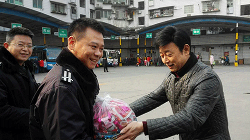 2月5日,市交通運輸局副局長蒲五才深入城北汽車客運站慰問一線員工,并要求車站要重視從事春運工作人員的身體健康,針對今年春運客流及運輸生產(chǎn)情況,做好各項安全生產(chǎn)管理工作和各項服務(wù)工作,不讓旅客滯留在車站,確保春運平安祥和。圖為市交通運輸局副局長蒲五才(右)一行來到城北汽車客運站,看望慰問奮斗在春運一線的車站員工。